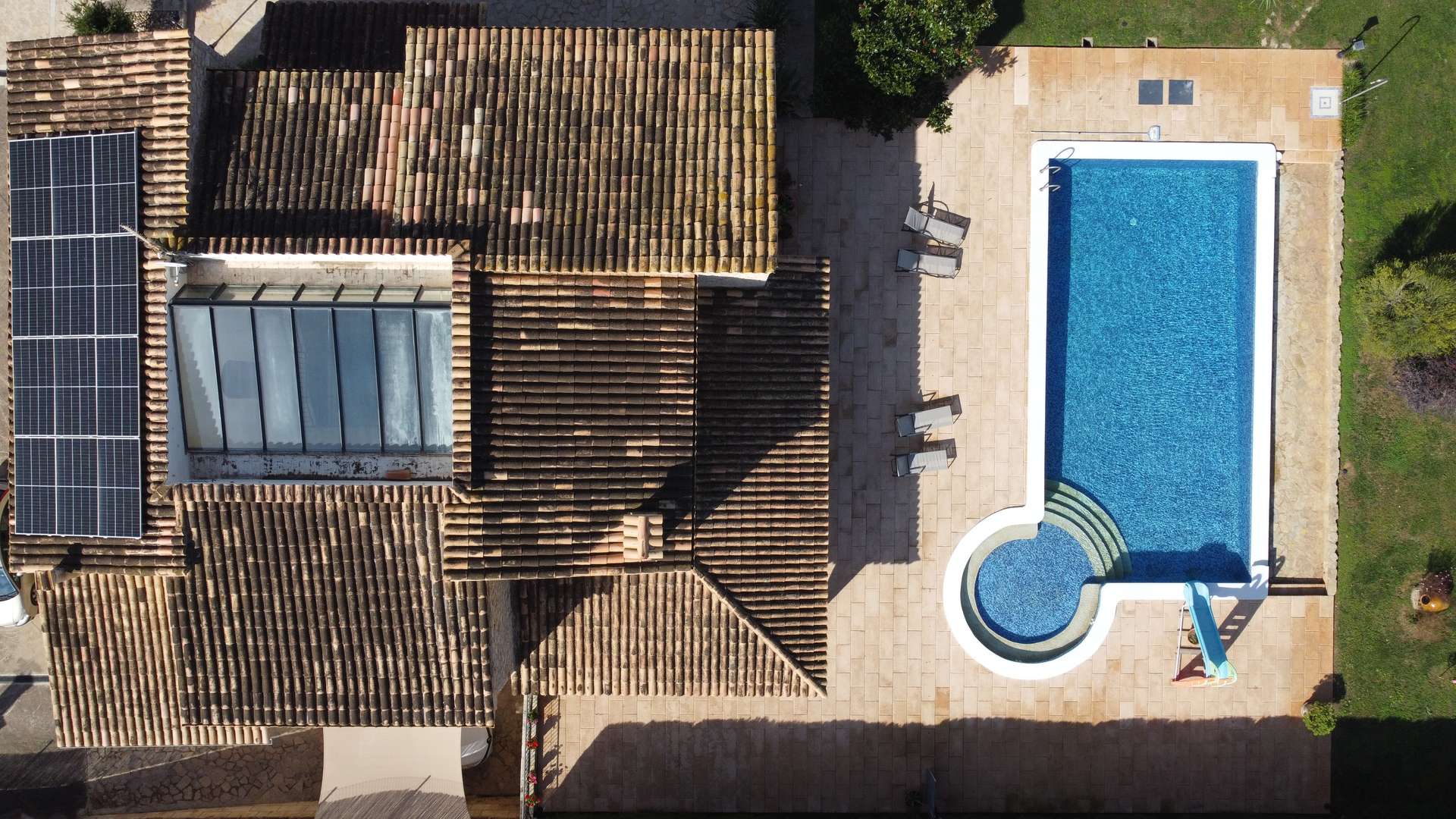 Das Herzstück des Hauses ist ein typischer mallorquinischer Kieselstein-Patio (30 m²), der durch ein Oberlicht überdacht ist und für natürliches Licht im gesamten Haus sorgt – eine warme und einladende Atmosphäre entsteht.
