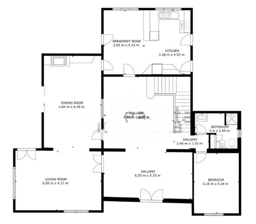 Erdgeschoss: Eingangsbereich, separate Küche, ein voll ausgestattetes Badezimmer, ein Schlafzimmer, Wohnzimmer und ein großzügiges Esszimmer mit Kamin und direktem Blick auf den Innenhof und den Pool.